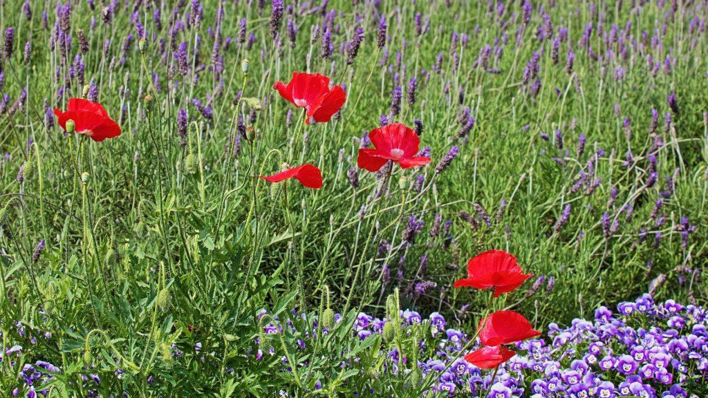 These are both classic flowers that pair beautifully. The sturdy, sweetly-scented lavender makes a great backdrop for the delicate poppies.