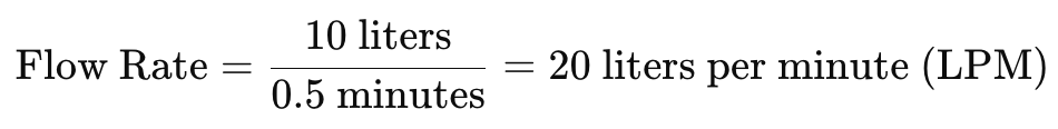 - Calculate Flow Rate: 10 litres ÷ 0.5 minutes = 20 litres per minute (LPM)