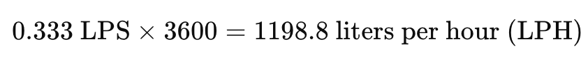 - Litres per Hour: Multiply the flow rate in LPS by 3600.