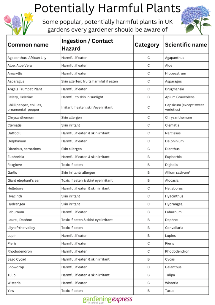 Please note that this list is not exhaustive, and plants are categorised from A (most toxic) to lower levels of toxicity.