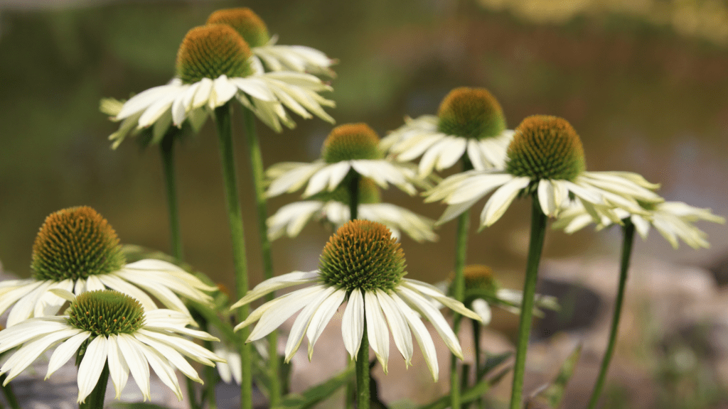 - Echinacea purpurea White Meditation: This plant grows to a height of fifty centimetres and spreads out in spring and summer before dying in autumn. It features narrow, dark green leaves. From summer to autumn, it produces numerous large white flowers with reflex petals and a central cone that starts yellow-orange and darkens to bronze with age.