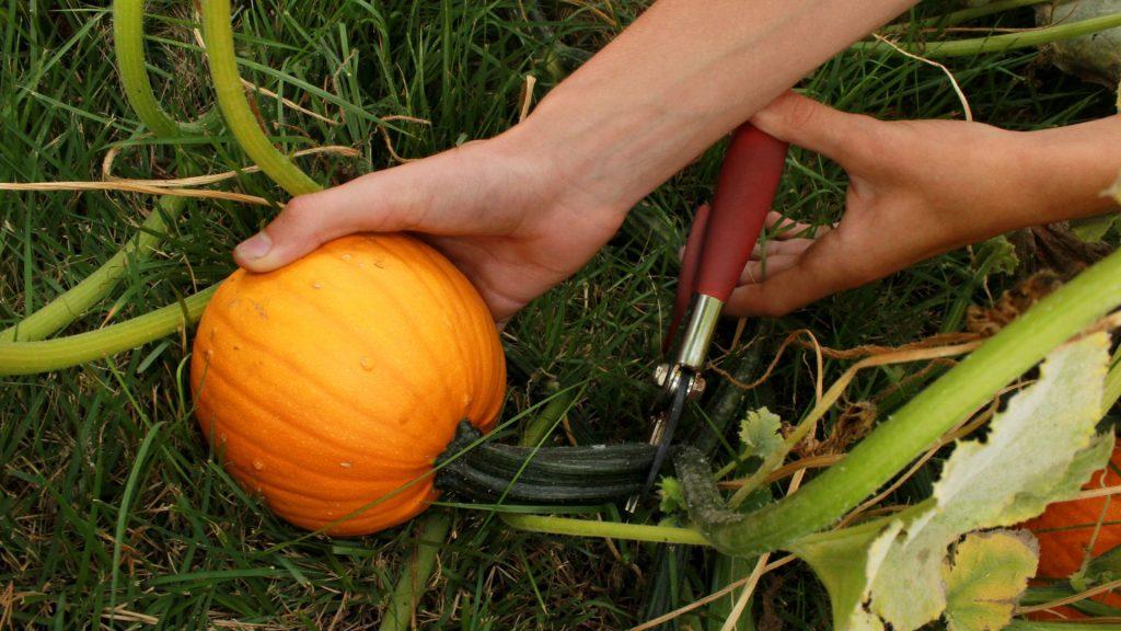 - Cut the pumpkin from the vine with a sharp knife, leaving a few inches of stem attached.