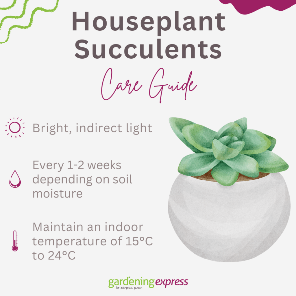 Maintain an indoor temperature of 15°C to 24°C with slightly cooler nights. Succulents thrive in lower humidity, so keep levels in check to prevent root problems.