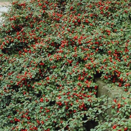 This small, spreading evergreen shrub is tolerant of a wide range of conditions, and its self-rooting tips spread to form a low blanket of weed-suppressing dark green foliage. Cotoneaster shrubs can be studded with small white flowers in spring, followed by bright red autumn berries, with the leaves often turning orange/red as temperatures cool in autumn and winter.