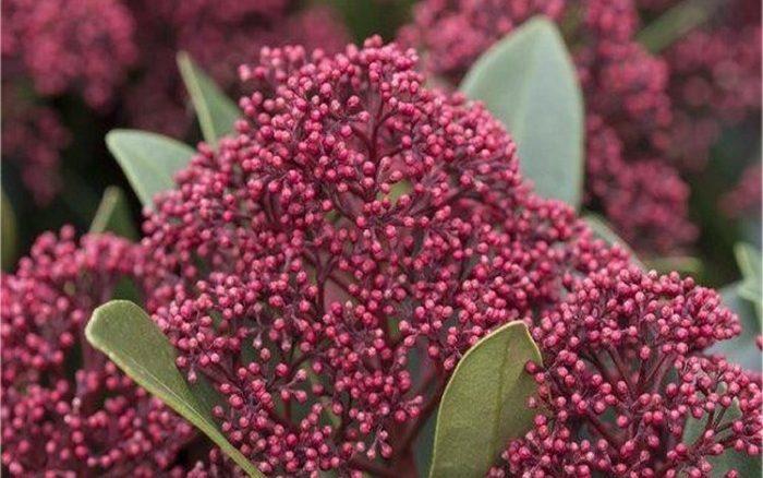 Skimmia is a hardy, compact, evergreen shrub with dark green glossy leaves and clusters of sweetly fragrant spring flowers. Additionally, some varieties provide long-lasting, decorative berries in the fall and winter. Because of their rounded mounds of oval, leathery, dark green or reddish leaves, these slow-growing shrubs are ideal for creating structure in borders or pots.