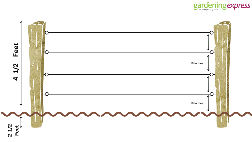 - Install 4-inch-long eyebolts in the posts at regular intervals: 18 inches from the ground, 36 inches, and 54 inches. Maintain a 2-inch-wide space between the wooden post and the eyebolt. This space allows for the growth of your tree’s branches.