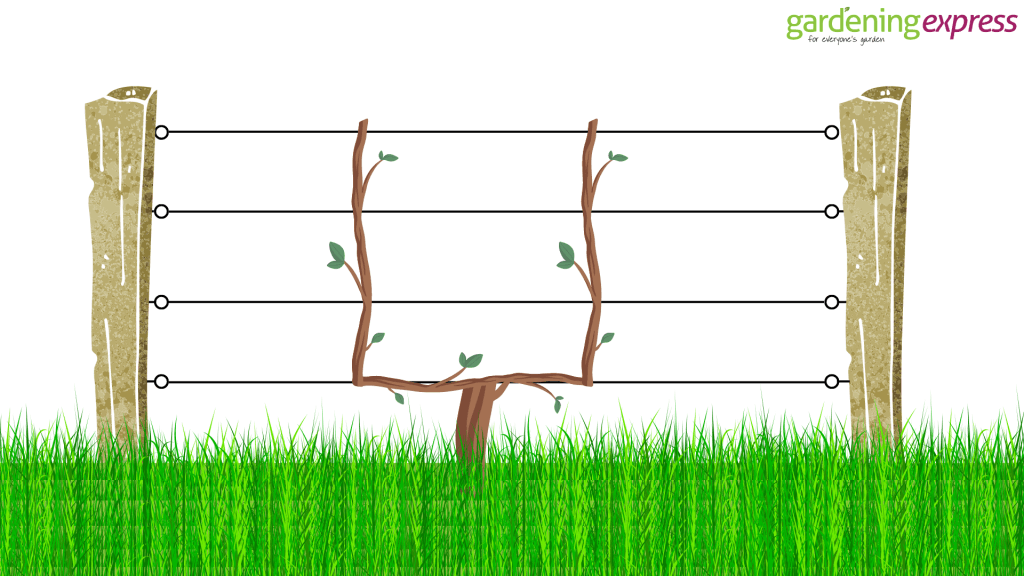 - Tie branches to the wires using nursery tape, leaving the tips of the branches free to grow upward. This encourages branch growth.