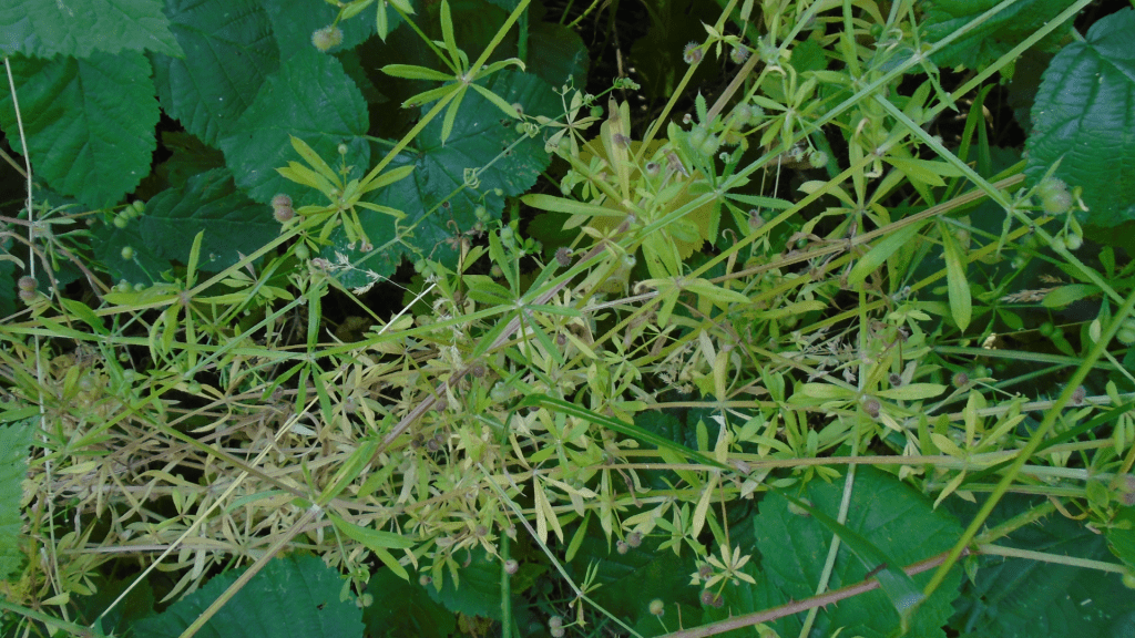 This long sprawling annual weed can reach up to 1m in height and features whorls of slim leaves. It produces insignificant white flowers and green hairy seeds in large quantities.