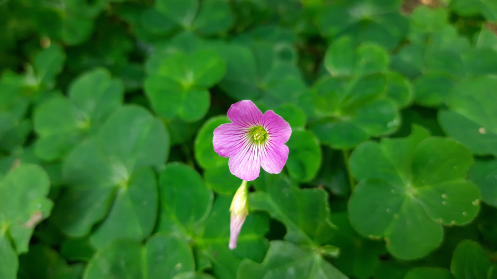 Clover-like with red-tinged leaves, oxalis exhibits small yellow or pink flowers. It is a fleshy perennial with persistent roots and spreads through explosive seeds, bulbils, and rooting stems.
