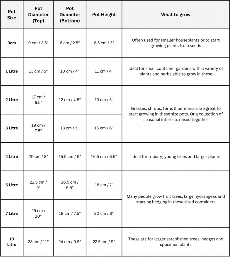 All pot sizes are approximate and will vary depending on shape. To calculate your pot size, we suggest using this calculator, or as a guide, look at our pot size chart and recommended plants for round pots: