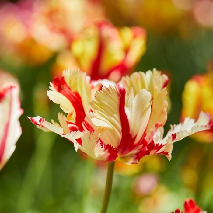 If you are planting tulips in pots, we recommend following the bulb lasagne method. This will require you to have an adequate-sized pot with drainage holes and good-quality multi-purpose compost. To complete the bulb lasagne, you must add a layer of soil (at least 12cm deep) and insert the bulbs (with the pointy end facing upwards) into the foil layer, leaving at least 4cm between bulbs. Now add another layer of soil and position the bulbs diagonal to the bulbs below. Repeat this process with the latest flowering bulbs at the bottom of the pot and the earliest flowering bulbs at the top. Once this has been completed, add the final layer of soil (around 12cm deep) to the top and water gently. For more in-depth instructions, read our bulb lasagne article