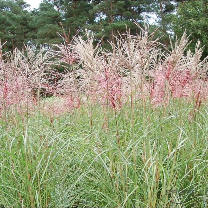 This ornamental grass offers clump-forming growth, fine arching leaves turning orange in autumn. Its feathery red flower panicles mature to pink-silver.