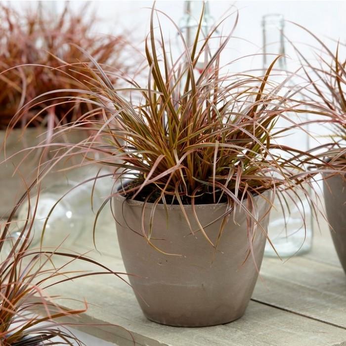 Firedance is a stunning ornamental grass with bronze evergreen leaves edged in scarlet red, creating a flame-like appearance. Its compact size and colours make it ideal for containers.