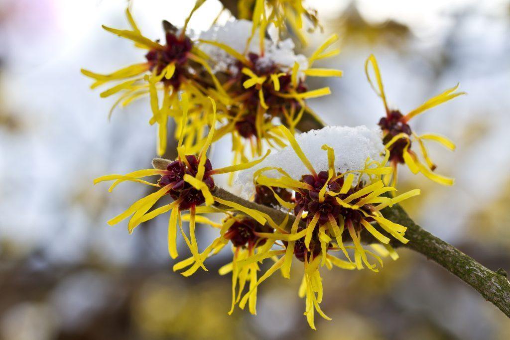Witch hazel is a deciduous shrub with wiry yellow flowers that appear on bare branches in winter. They add plenty of interest to the garden at all times of the year, but look stunning when they have a light covering of snow. This species is great for a woodland garden because it is resistant to pests and hardy. It grows best in neutral to slightly acidic soil, in a sheltered position.