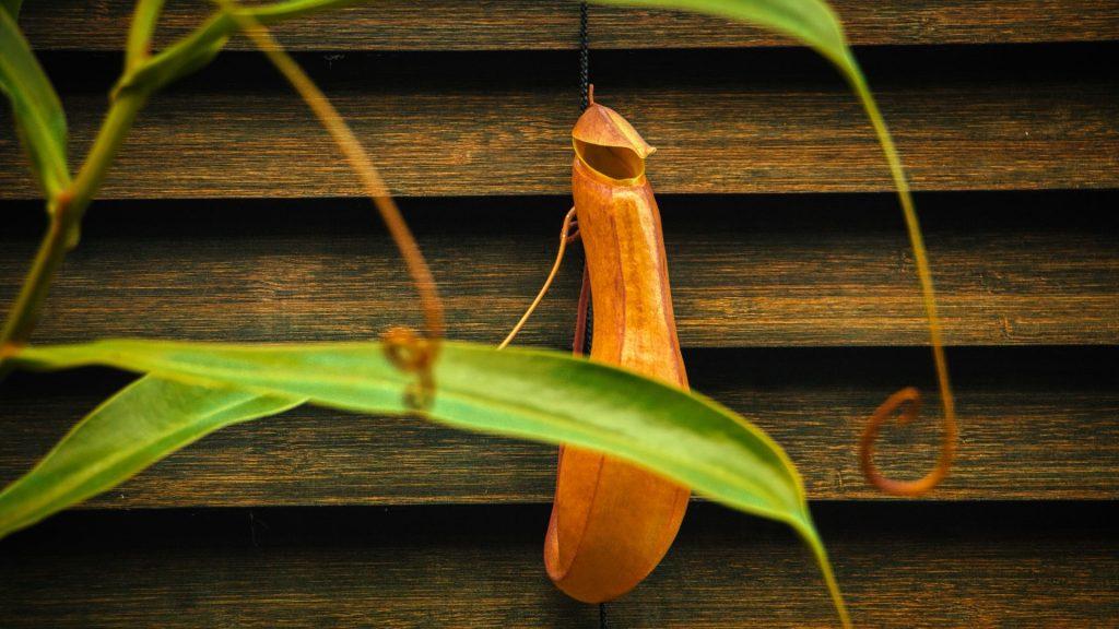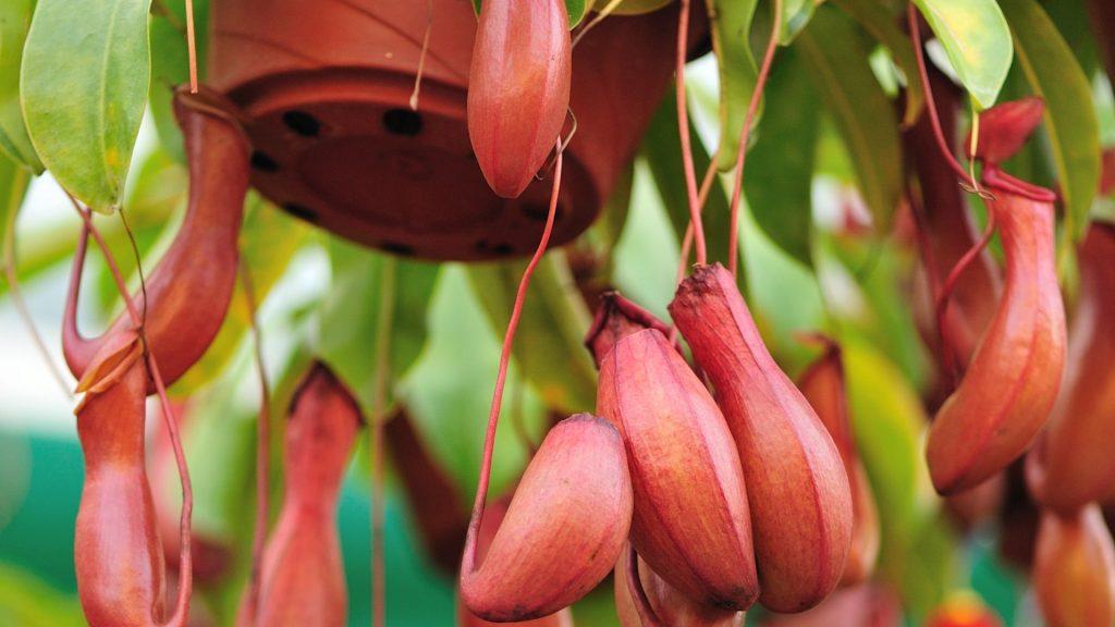 This tropical plant is known as Monkey Jars. It gets this name from the eye-catching pitchers that hang from the crown of green leaves. Reminiscent of hanging jars, these pitchers attract insects with both their bright colours and sweet nectar. This plant makes a gorgeous addition to any home, acting as both a unique hanging plant and a handy pest control tool.