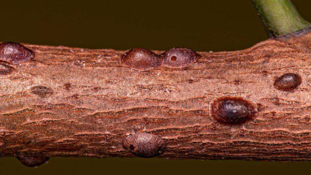 These insects get their name from their scale-like appearance. The females are hidden beneath domed scales, often appearing as small bumps on stems and the undersides of leaves. The males, however, are similar to small flies. They suck the sap from plants, leaving a coat of honeydew in their wake.